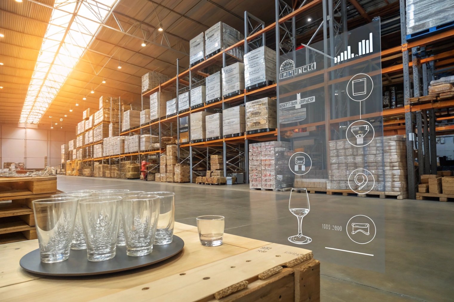 Smart glassware warehouse with stacked pallets and tray of tumblers on crate