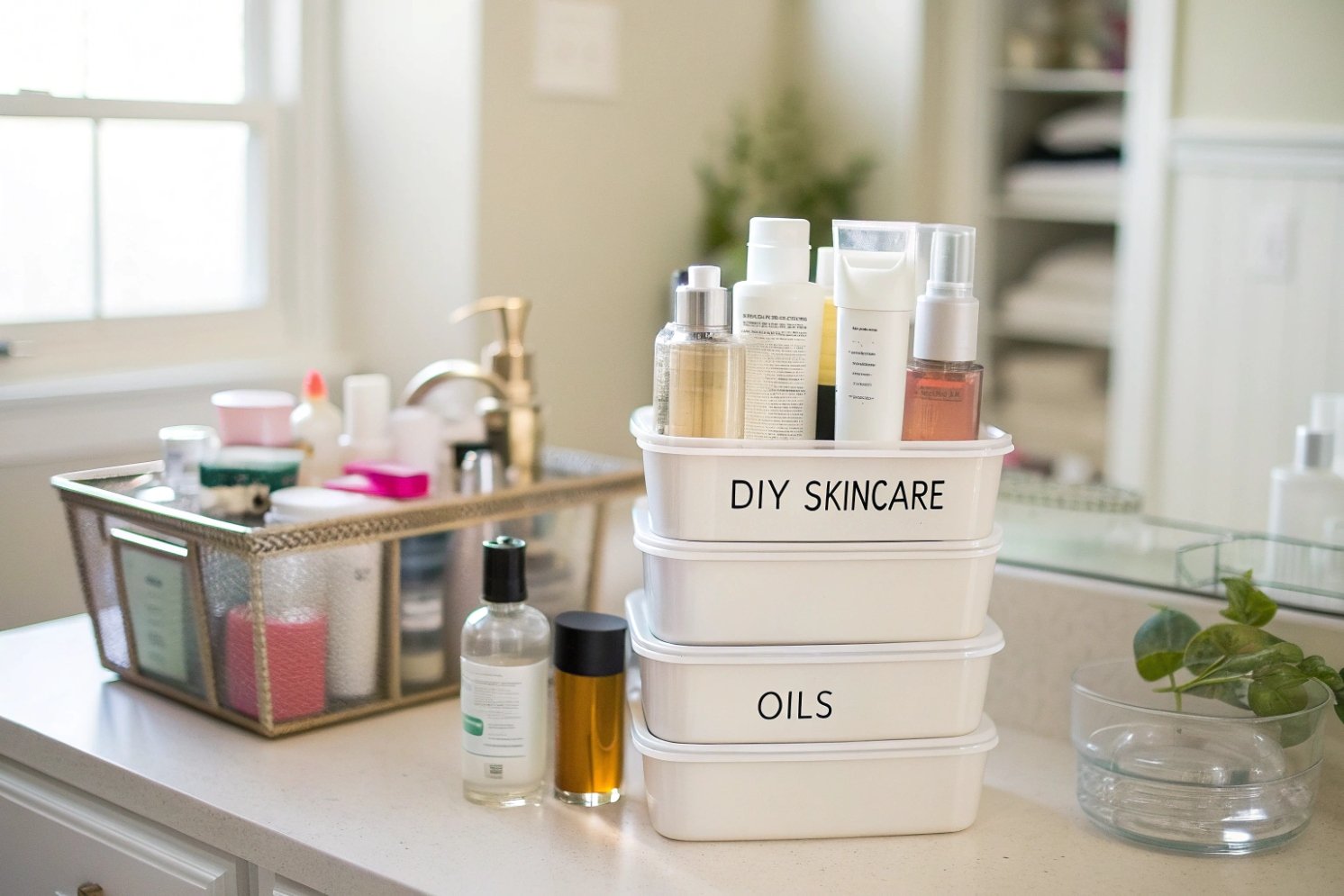 Bathroom counter with labeled DIY skincare and oils containers and cosmetic bottles.