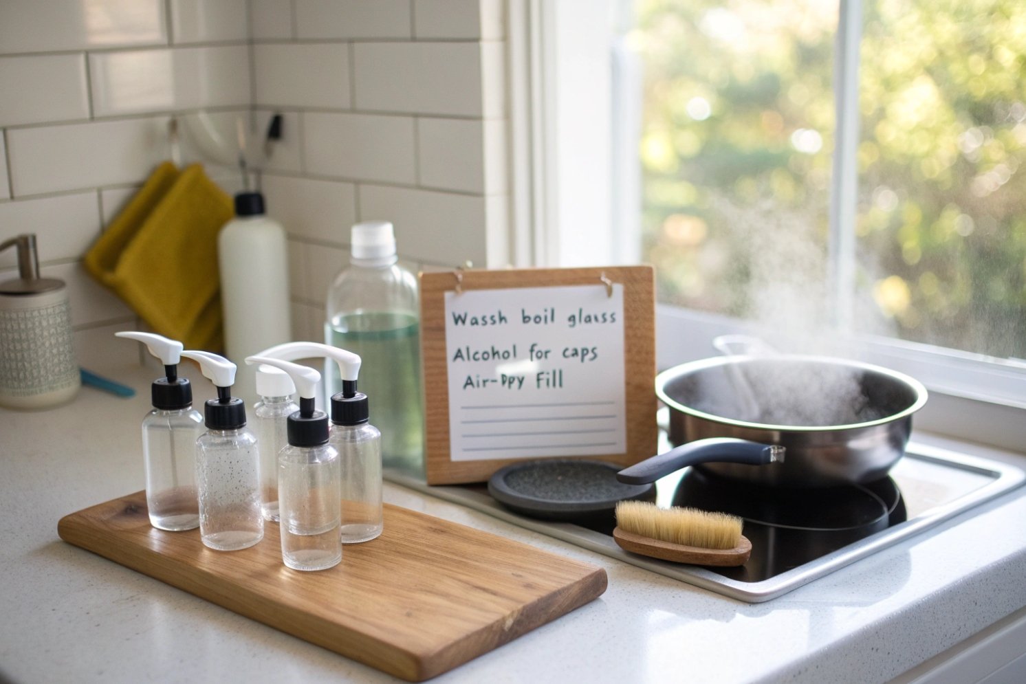 Washing comes first, always. Boiling a dirty bottle will not “burn off” oils or pigment. Soap and water do that job. Take time with the first wash, especially for bottles that held oil serums or fragrance.