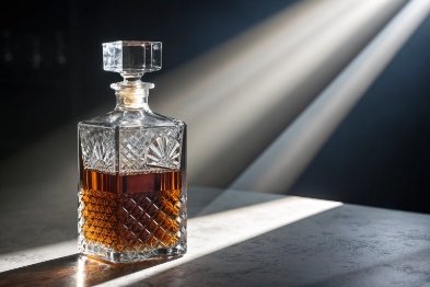 Cut-glass whiskey decanter with amber liquor in sunbeam on stone surface