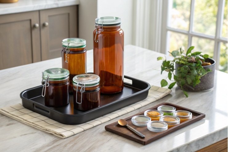 Amber clip-top glass jars on kitchen island tray, ideal for food storage.