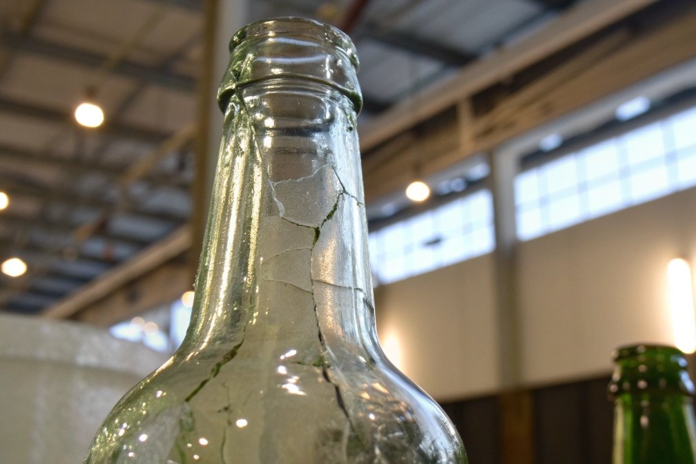 Cracked glass bottle neck in factory