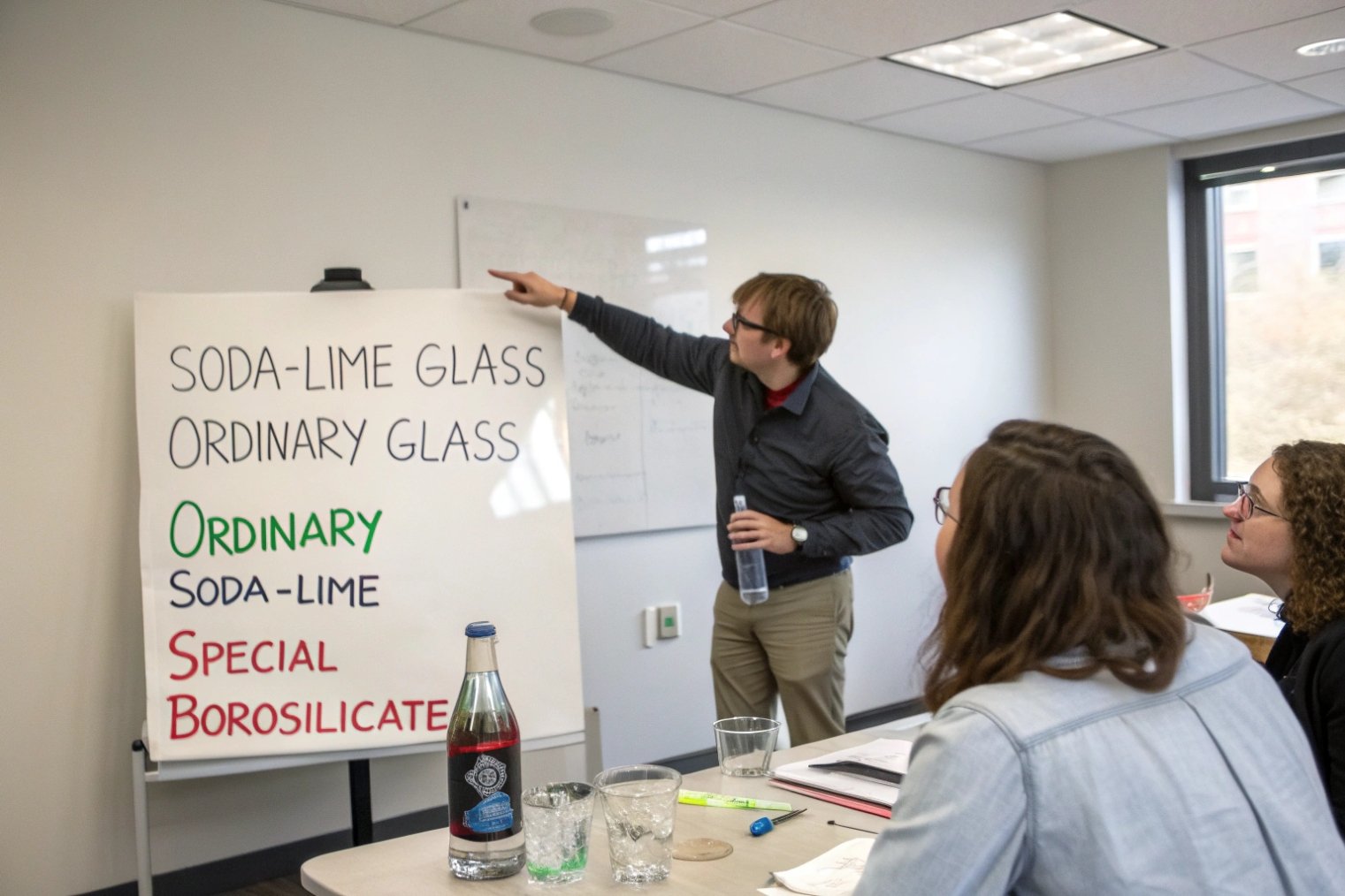 Team training about soda-lime and borosilicate glass differences in meeting room