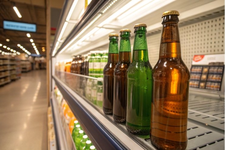 Green and amber glass beer bottles lined on refrigerated supermarket shelf display.