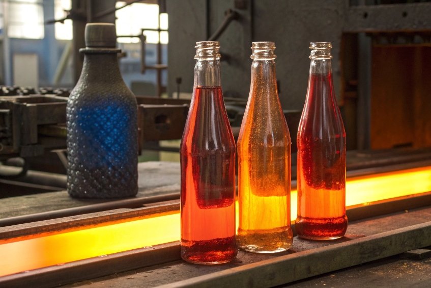 three glass bottles with red and orange liquid standing on hot conveyor in glass factory