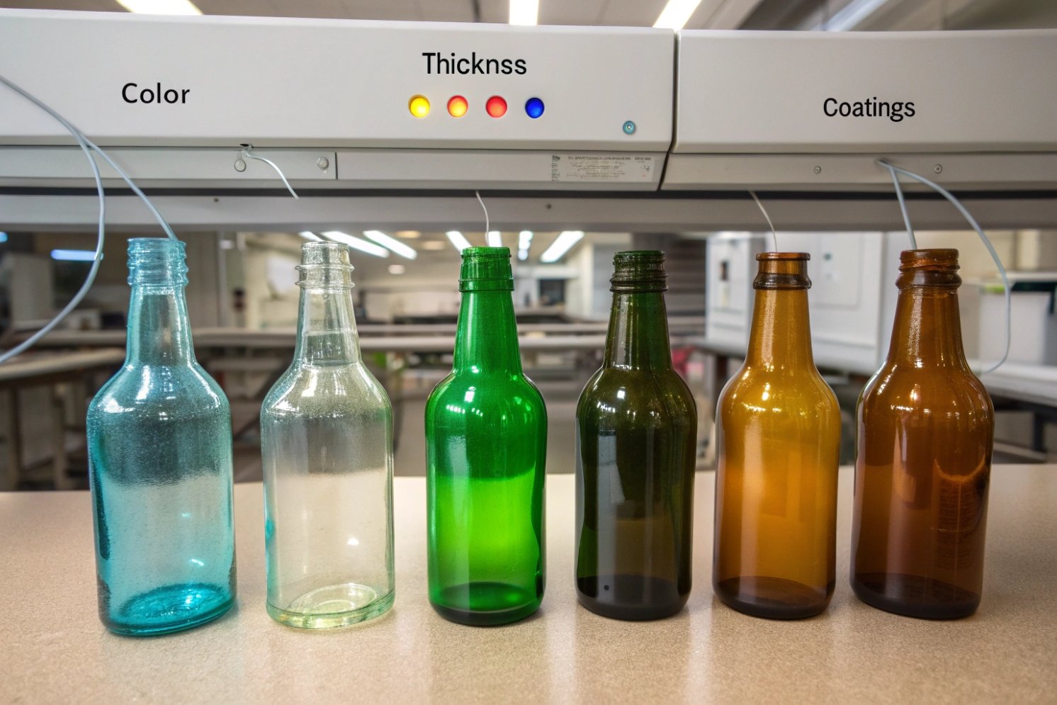 Row of six glass bottles in different colors under an inspection bar labeled Color, Thickness and Coatings