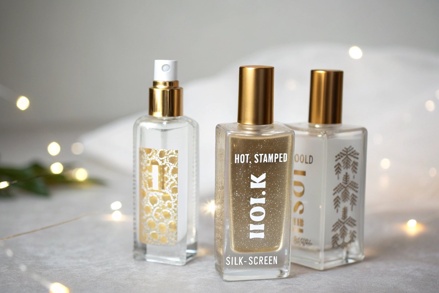 Hot stamping fits luxury branding because foil reads as “premium” at first glance. Gold and silver are common, but there are also colored foils, holographic foils, and pearlescent foils. On glass, hot stamping is often used for: