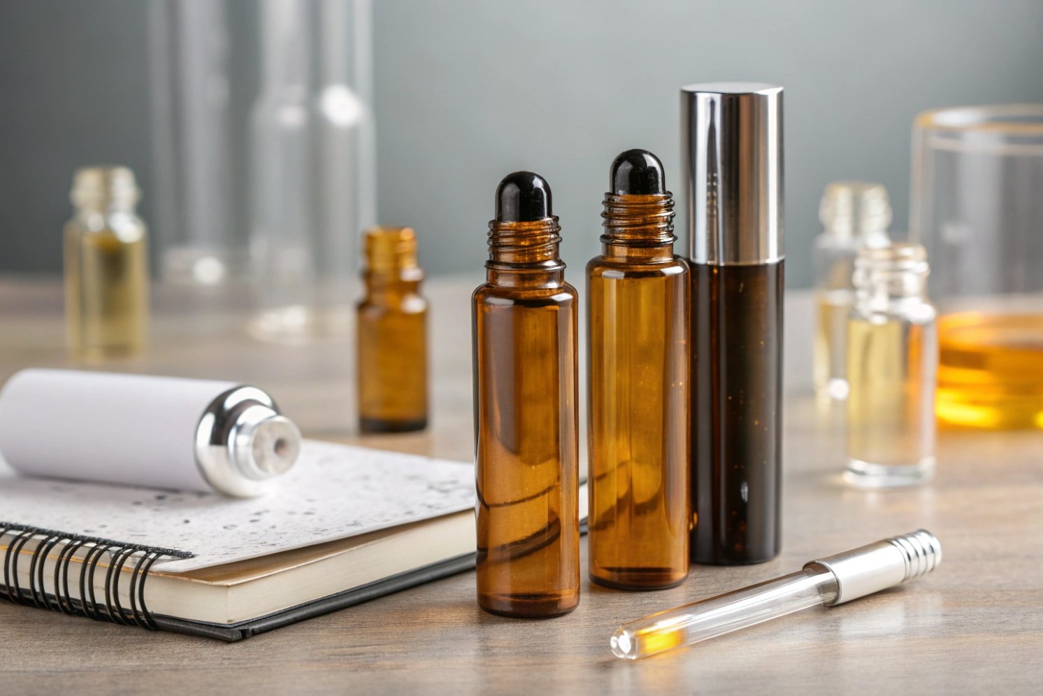 Amber glass roll on bottles for essential oils on desk with notebook and pipette.