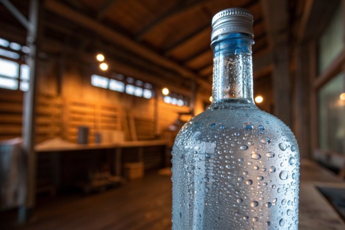 Frosted glass spirits bottle with condensation droplets on bar counter in warm lighting