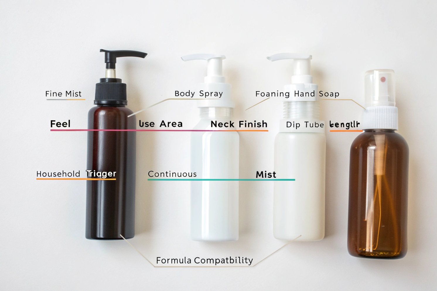 Fine-mist pumps suit perfumes and skincare, trigger sprayers suit cleaners, and foaming or continuous sprayers suit soaps and hair care. Neck finish, dip-tube length, output, and material compatibility decide whether the pack works or fails.