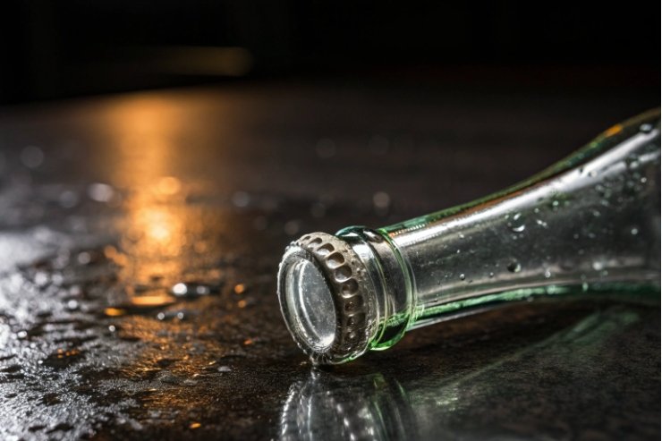 Green glass bottle lying on wet surface with crown cap in close-up.