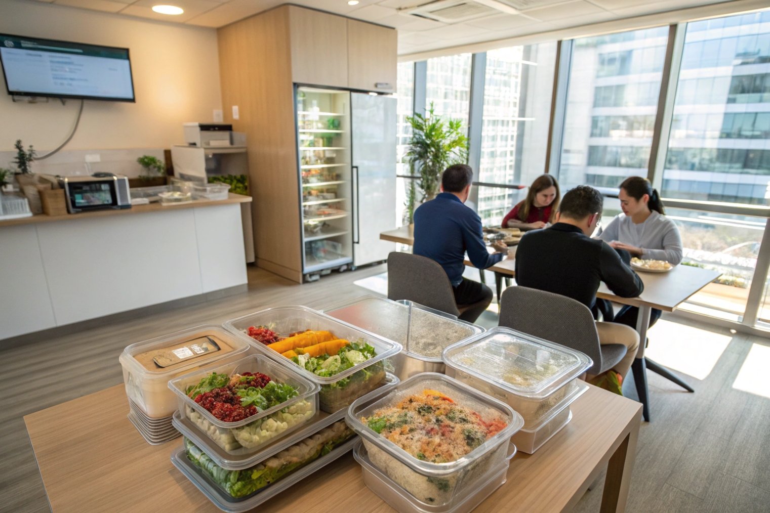 Office workers eating lunches with stacked glass meal prep containers in bright breakroom