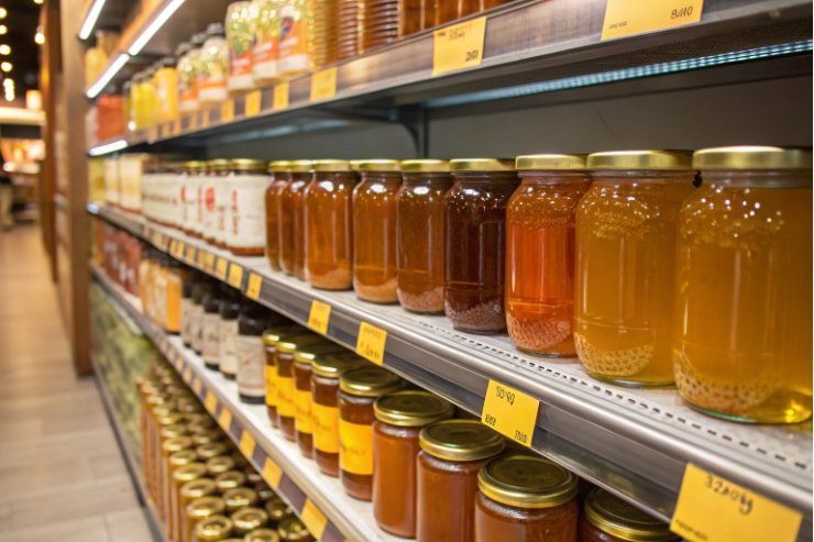 Supermarket shelf stocked with assorted glass honey jars and golden metal lids