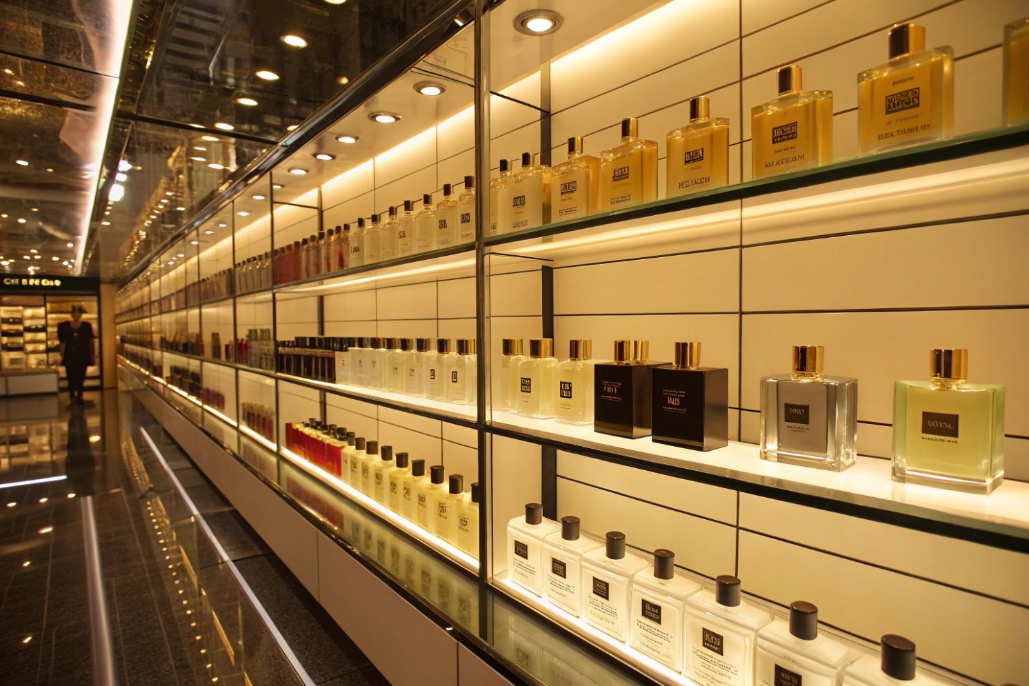 Long, glowing wall of neatly lined perfume bottles in a luxury store